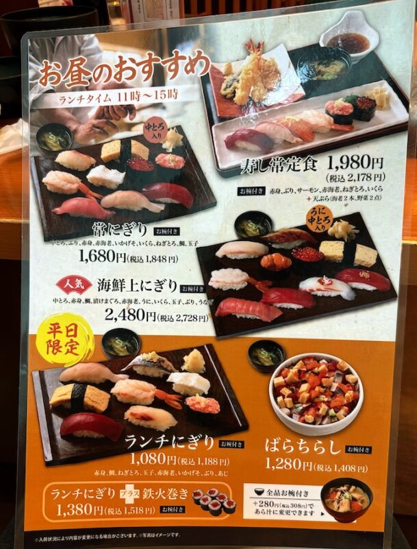 別に感動するほどおいしいわけではない普通のお寿司やさんチェーン。価格は2,000円前後。