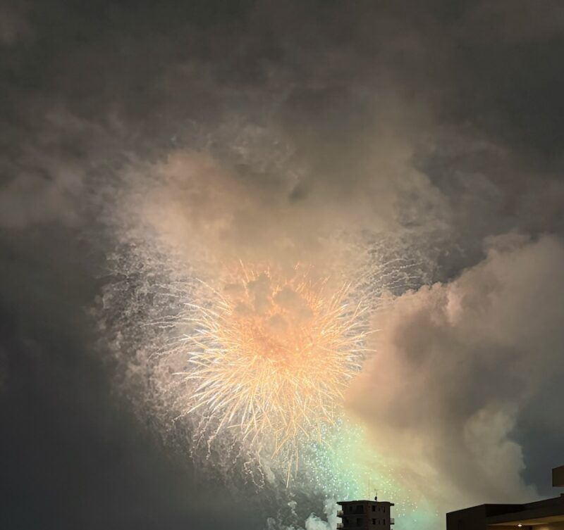 今のマンションは、玄関を出ると、そこから花火🎆が正面に見えるというラッキーな立地のため、ぬかるみ状態の河原に傘☂️さしながら座る必要がなく、ビール🍺片手に玄関一歩でて、トイレも上着もビールのお代りもいつでも取りに行ける状態、ととても恵まれた環境です。